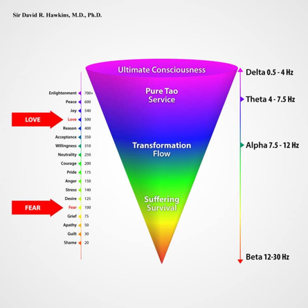 Maar eerst terug naar wat de keuzes gebaseerd op angst met je doen. Hierover is heel wat wetenschappelijke informatie. Zodat je een beter inzicht krijgt in hoe de keuze voor angst jouw krachtig essentiële vibratie dimt. Zodat je gaat over-leven. Angst is een ruim begrip voor heel wat op angst gebaseerde gedragingen en gevoelens. De kegel, de bewustzijnsschaal van Sir Hawkins, hieronder geeft visueel duidelijk weer wat er bij liefde en wat bij angst hoort, samen met de bijhorende trilling of frequentie gemeten in het energieveld van de hersen (cfr figuur Anna Wise verder in de blog). Vanaf de kwaliteit ‘moed (courage)’ start de transformatieflow van angst naar liefde.