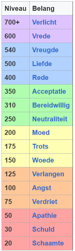 Deze bewustzijnsniveaus lopen op van een schaal van 1 tot 1000, van een “laag bewustzijn” naar een “hoog bewustzijn”. De schaal is verdeeld in zeventien lagen, waarbij de bovenste laag staat voor het ultieme bewustzijn en de onderste laag voor het laagste bewustzijn. Elk bewustzijnsniveau correleert met specifieke gedachten, gevoelens, emoties, overtuigingen, gedrag, houding enz…. Iedere verhoging op de bewustzijnsschaal leidt tot meer kracht en gevoelens van vervulling, welzijn en geluk . Het kiezen voor de gevoelens vanaf de groene kleur in de tabel en hoger kan iemands leven radicaal veranderen.